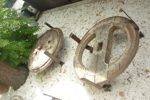 Mesa hecha con una rueda antigua de carro gallego.Con tapa de cristal que no aparece en la foto. Hay varias ruedas diferentes.